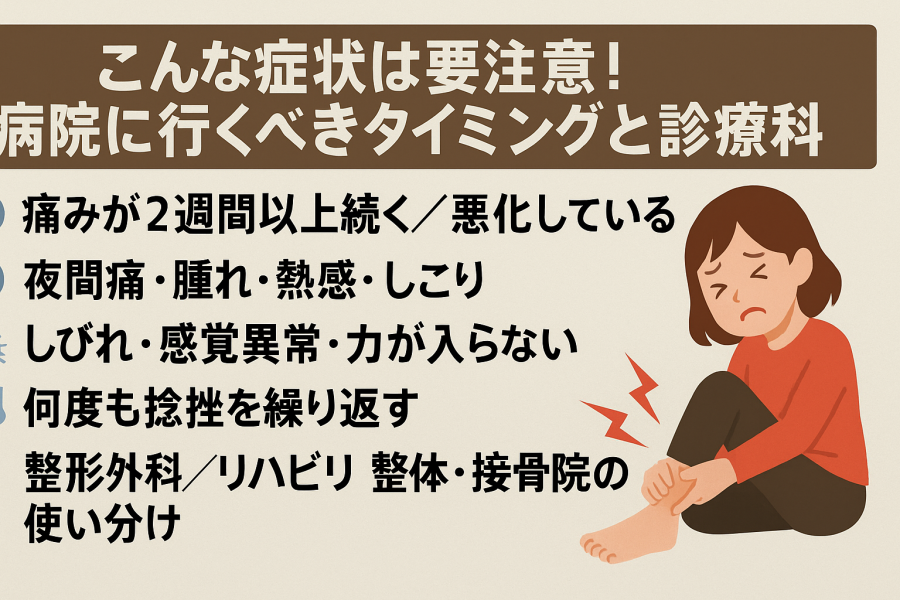 「足首が固まるけど、まだ様子を見ても大丈夫かな?」と悩む人は多いですが、あるサインが出たら“放置せず相談した方が良い”と言われています。ここでは、来院を考えるべき症状と、整形外科・リハビリ・整体や接骨院の使い分けをわかりやすくまとめます。