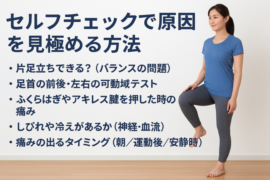 「足首が固まる原因って、自分である程度わかるの?」とよく聞かれます。実は、簡単なセルフチェックを行うことで「筋肉の問題か?」「関節の問題か?」「神経や血流の問題か?」など、おおよその方向性をつかむことができると言われています。ここでは、自宅でできる5つのチェック方法を会話形式で分かりやすく紹介します。
