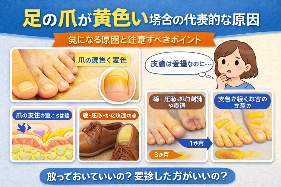 「足 黄色」で検索する人の主な悩み整理「足が黄色っぽい…これって大丈夫?」と不安になりますよね。実は“黄色く見える”といっても、原因の入口は1つじゃないと言われています。たとえば、最近ぶつけた覚えがあるのか、靴や仕事でこすれるのか、爪だけなのか、足全体なのか。まずはここを整理すると、考えやすくなるとされています。