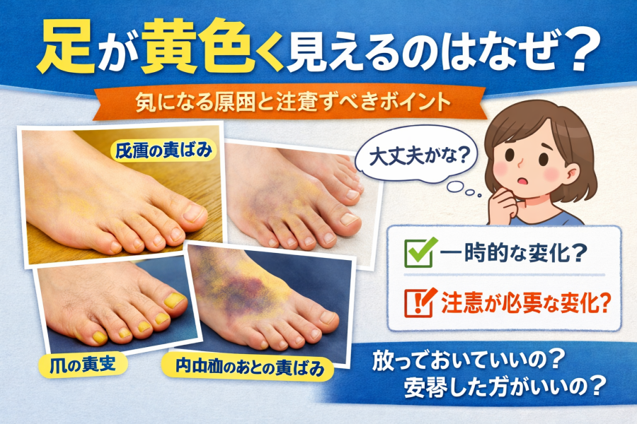 一時的な変化の目安は「時間とともに薄くなる」「範囲が広がらない」などが多いと言われています。一方で、ぶつけた覚えがないのに繰り返す、急に広がる、痛み・熱感・強い腫れがある、あるいは足だけでなく白目や全身も黄色いように感じる場合は、早めに医療機関で確認したほうがよいケースもあるようです。