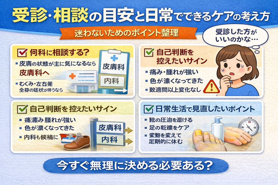 一方で、むくみや左右差、全身のだるさなどが重なる場合は、体全体の状態も含めて確認する視点が大切だとされています。迷ったときは、受付で症状を具体的に伝えることが参考になるようです。