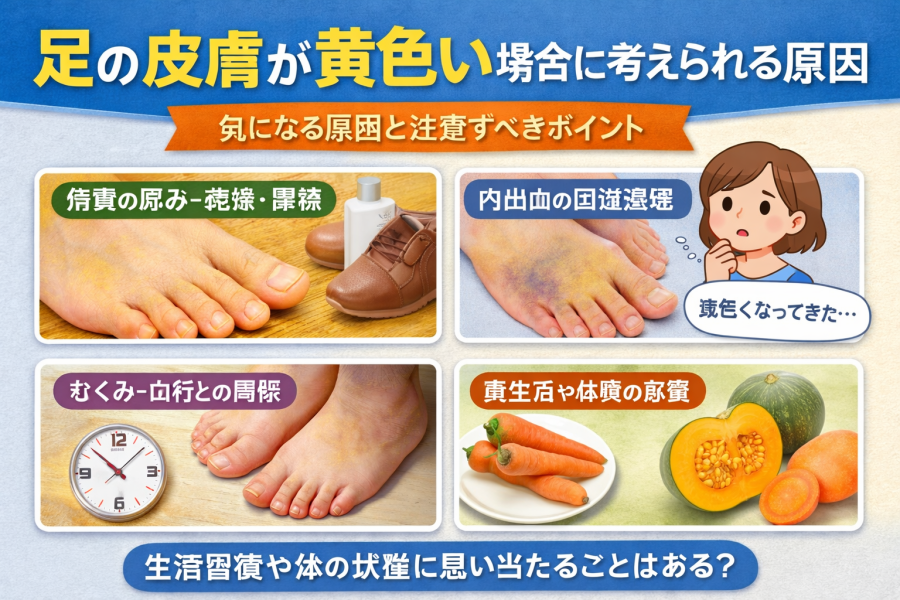 「痛くはないんです。見た目だけが気になって」足の皮膚が黄色く見える背景には、日常的な刺激や体の巡りが関係している場合もあると言われています。代表的な考え方を整理します。