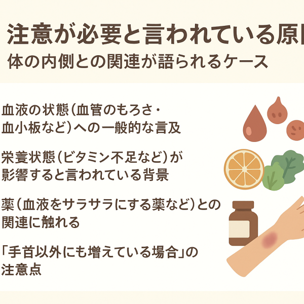 手首だけでなく、腕・脚・腹部など複数の場所にあざが増えている場合、体の内側の変化が関係する可能性も語られています。