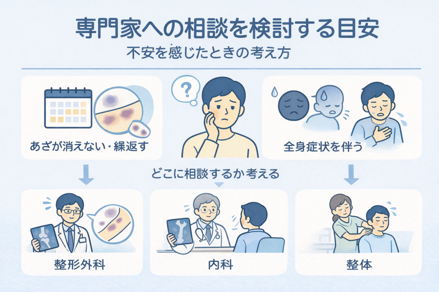 相談先としては、ぶつけた心当たりがある・関節や骨の痛みを伴うなら整形外科、全身のだるさや息切れ、体の黄色さなどが気になるなら内科を検討するケースが多いようです。あざそのものの痛みより、肩こりや姿勢、体の使い方が気になる場合には、整体で体のバランスを整える相談をするという考え方もあります。どこが正解というより、「今いちばん気になっていること」に近いところから相談してみると、次の一歩が見えやすくなると言われています。