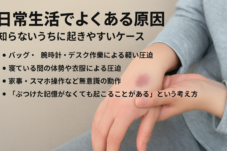 手首は皮膚が薄く、血管が比較的表面近くを通っています。この構造のため、少量の出血でも色が透けやすく、「急にあざが出た」と感じやすいと言われています。時計やバッグの持ち手、デスク作業での接触など、日常の小さな刺激が積み重なる点も特徴です。