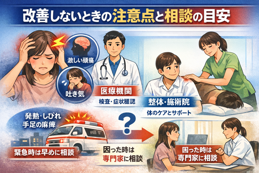 整体・施術院では、頭痛で寝れない背景として、首肩のこり、姿勢、スマホやデスクワークの負担、睡眠環境などを一緒に見直していくサポートが中心になることが多いようです。一方で、突然の激しい頭痛、ろれつの回りにくさ、発熱、しびれ、手足の弱さなどがある場合は、まず医療機関で危険な状態がないか確認する考え方が優先されると言われています。つまり、整体・施術院は日常負担の整理やセルフケアの補助、医療機関は重い症状の見極めや必要な確認、という役割の違いを意識しておくと選びやすくなりそうです。