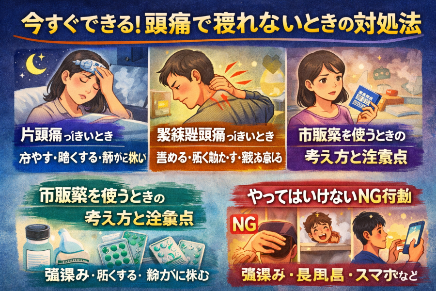 引用元:【⭐︎参考記事】https://ashiuraya.com/information/%E9%A0%AD%E7%97%9B%E3%81%8F%E3%81%A6%E5%AF%9D%E3%82%8C%E3%81%AA%E3%81%84%E5%8E%9F%E5%9B%A0%E3%81%AF%EF%BC%9F%E4%BB%8A%E3%81%99%E3%81%90%E3%81%A7%E3%81%8D%E3%82%8B%E5%AF%BE%E5%87%A6%E6%B3%95%E3%81%A8