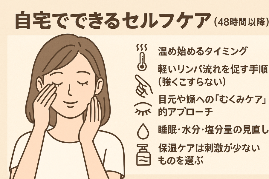 鏡を見て「ん? 片方だけ異様に膨らんでる気がする…」と感じたら、一度落ち着いて状態を確認する流れがすすめられることが多いです。