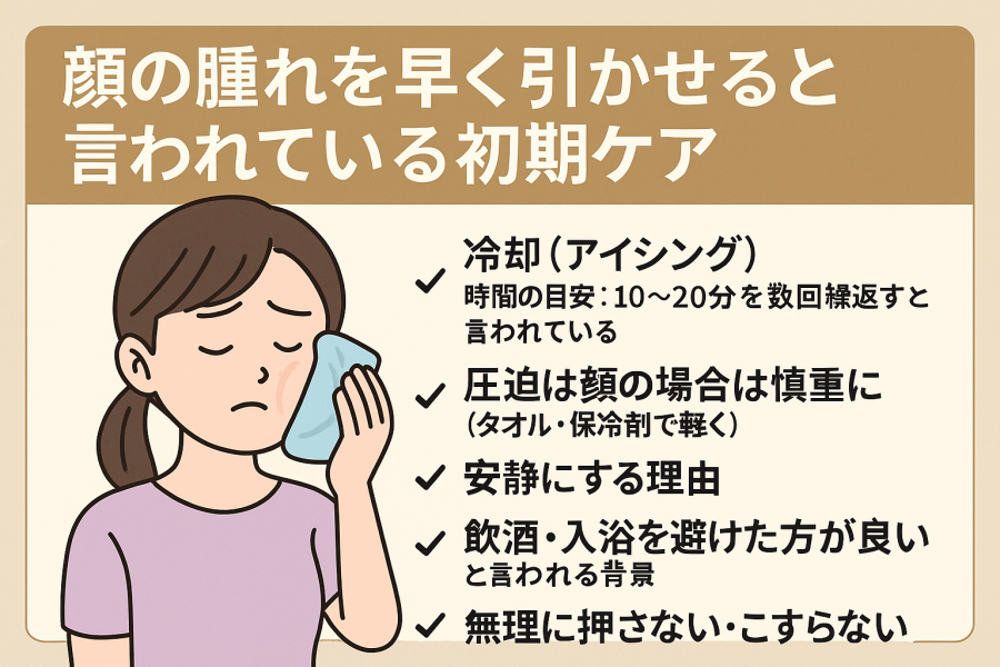 打撲した直後は“炎症がピークに向かう時間”とも言われ、余計な刺激を入れないほうが良いとされています。顔の場合は話したり笑ったりするだけで筋肉が動くため、意外と負担がかかりやすいのがポイントです。「少し静かに過ごすほうが、腫れが落ち着きやすいと言われていますよ」という説明がよく使われます。