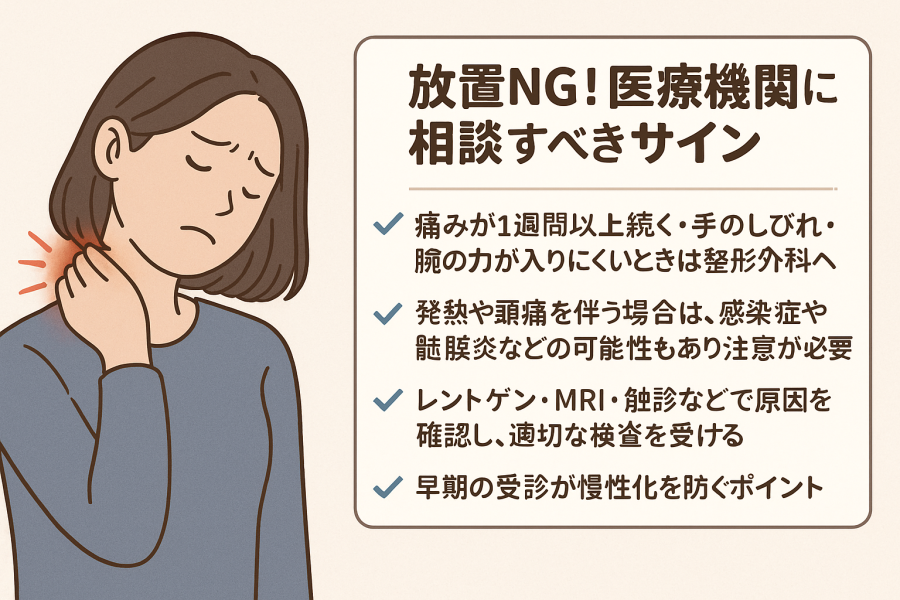 整形外科では、レントゲンやMRI検査で炎症や神経圧迫の有無を確認できるため、長引く場合は早めに相談することが大切です。