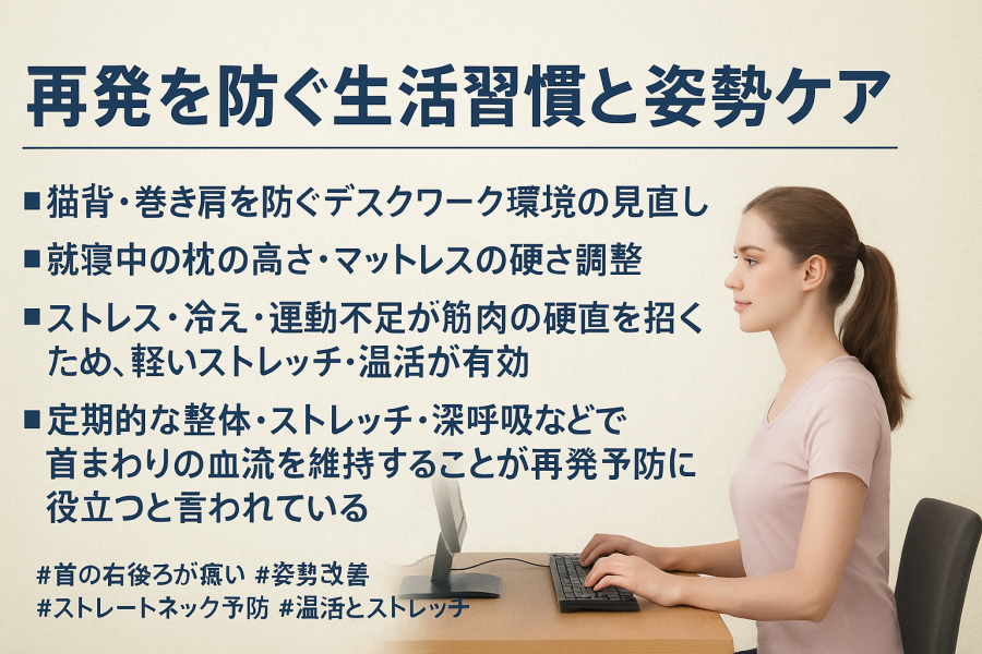 首の右後ろの痛みを繰り返す方は、**「姿勢」「睡眠環境」「生活リズム」**の3つを見直すことがポイントです。