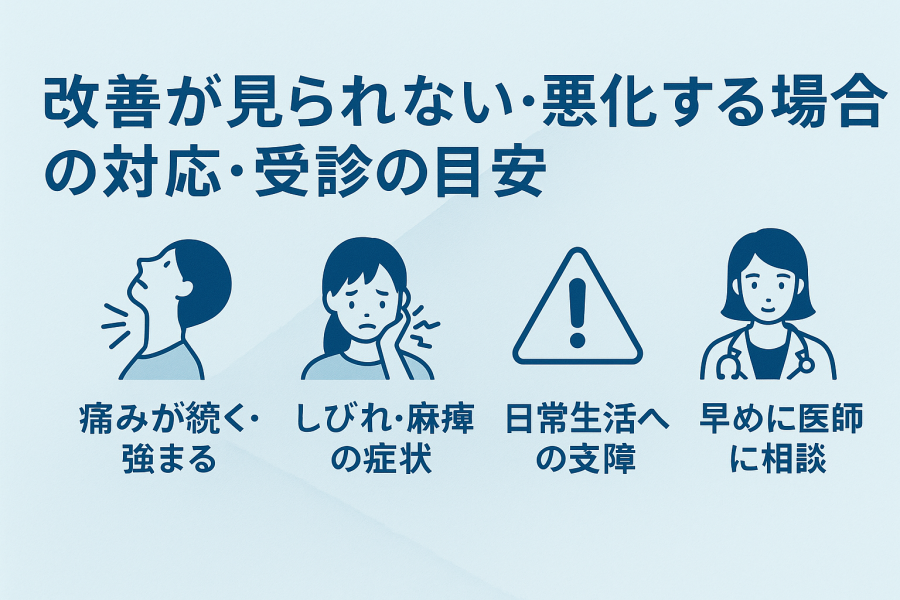 首を上に向けると痛みを感じるとき、多くは生活習慣の工夫やセルフケアで軽くなる場合もあると言われています。しかし、中には症状が長引いたり、悪化の兆候が見られるケースも存在します。そうしたときには無理をせず、早めに専門機関での相談を検討することが望ましいと考えられています。