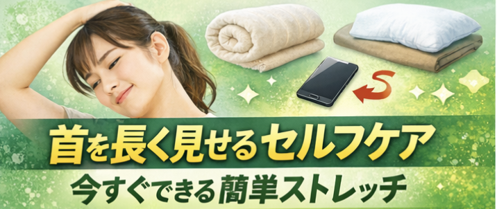 首を長く見せたいなら、いきなり強いストレッチをするより、肩が上がっていないか、胸が閉じていないか、スマホを見る姿勢が崩れていないかを確認する方が近道になりやすいです。なお、首の痛みが強い場合や、しびれ、頭痛、めまいなどを伴う場合は、自己判断だけで進めず、早めに医療機関へ来院することが勧められています。