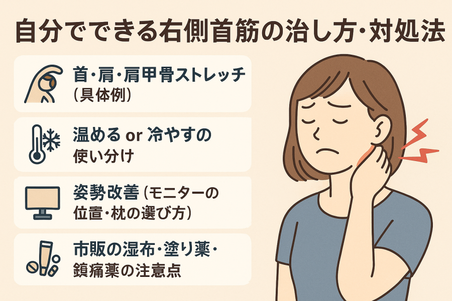 首筋の右側の痛みは、「ストレッチ+温冷ケア+姿勢+休息」の組み合わせで改善しやすいと言われています。