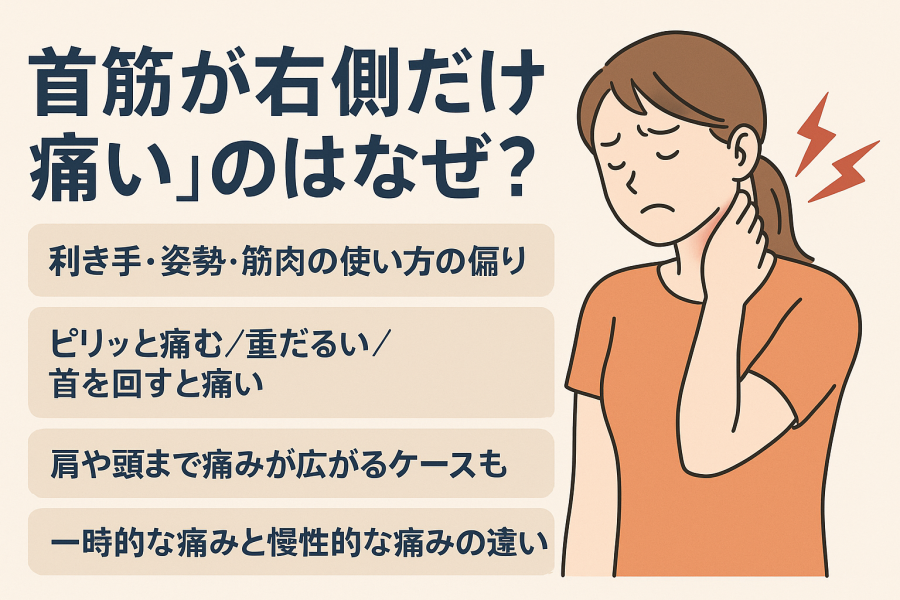 「首筋が右側だけ痛い」には、日常の使い方+筋肉の緊張+姿勢+神経の影響が複合していることが多いです。