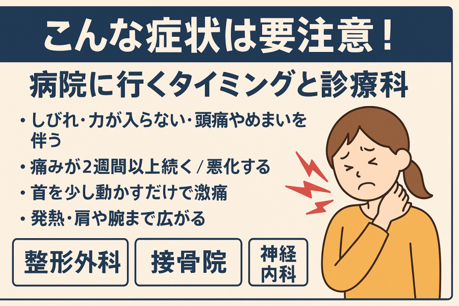 「首筋の右側が痛いけど、病院に行くほどかな?」と迷う人は多いです。しかし、中には早めの来院が望ましいサインもあると言われています。ここでは、放置しないほうがよい症状と診療科の選び方、検査や治療の選択肢をわかりやすくまとめます。
